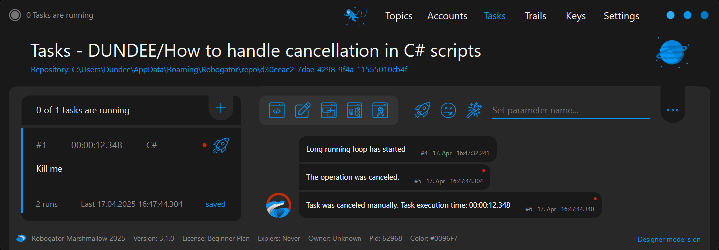 If you want to be able to use the kill switch to cancel a running C# script at runtime, you may need to manually place the possible cancellation stops in your script.