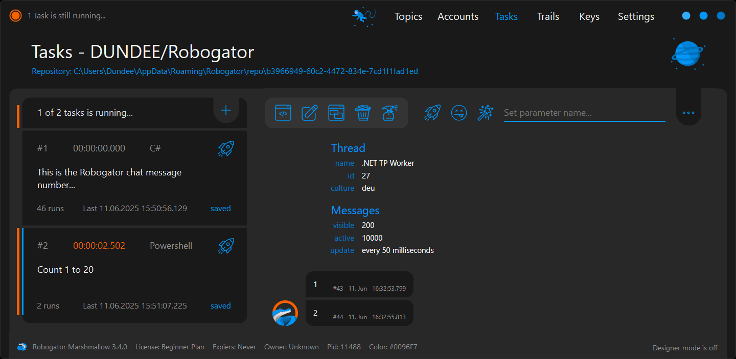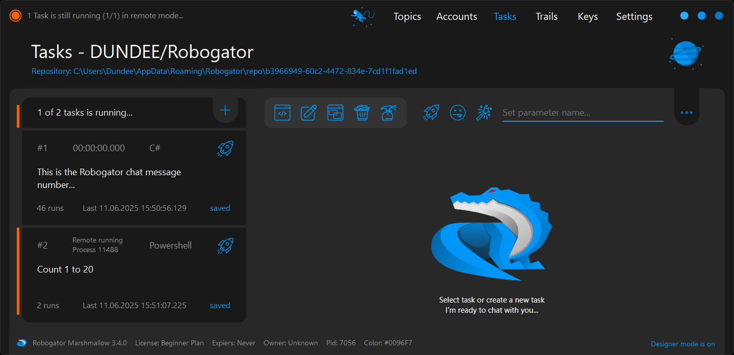 You can run multiple instances of Robogator simultaneously, whether in the foreground or background. However, all instances share the same Account and Task collection. This means that if a Task is already running in one instance, it cannot be started again from another, as it's considered active across all instances. Each Robogator window displays all currently running Tasks, along with a note indicating if a Task was started from a different instance.