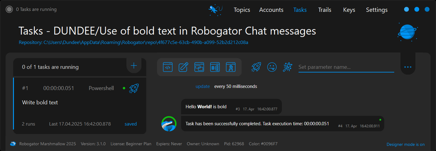 This example above generates a single Robogator Chat message with Hello World! as content and World! is in bold letters.